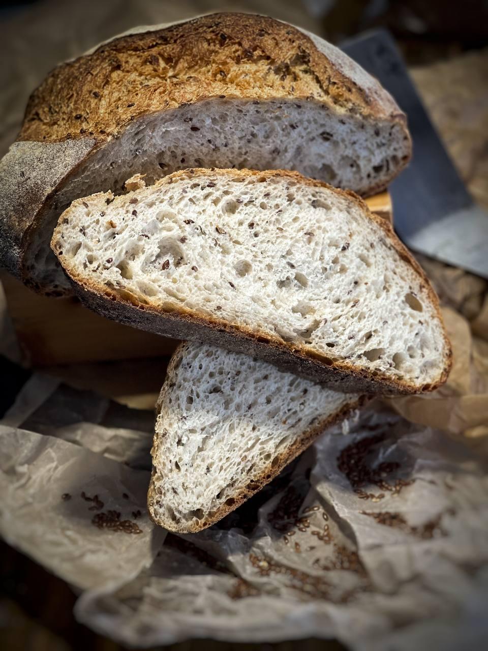 Всегда свежий хлеб "Лён" 700 грамм Состав: мука пшеничная высший сорт, мука цельнозерновая, вода, закваска пшеничная, соль, мёд